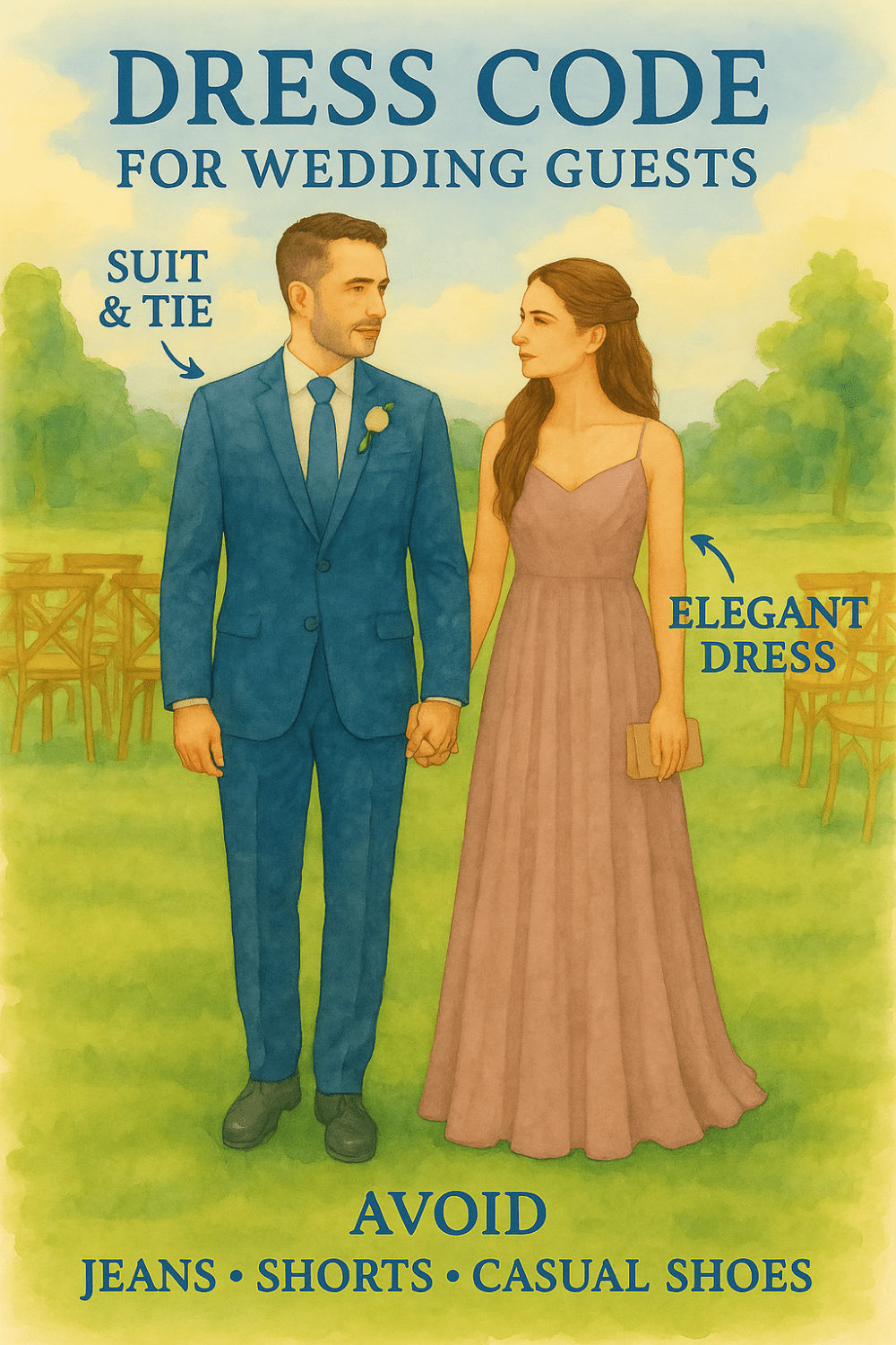 Para os homens: terno completo, gravata e sapato social.